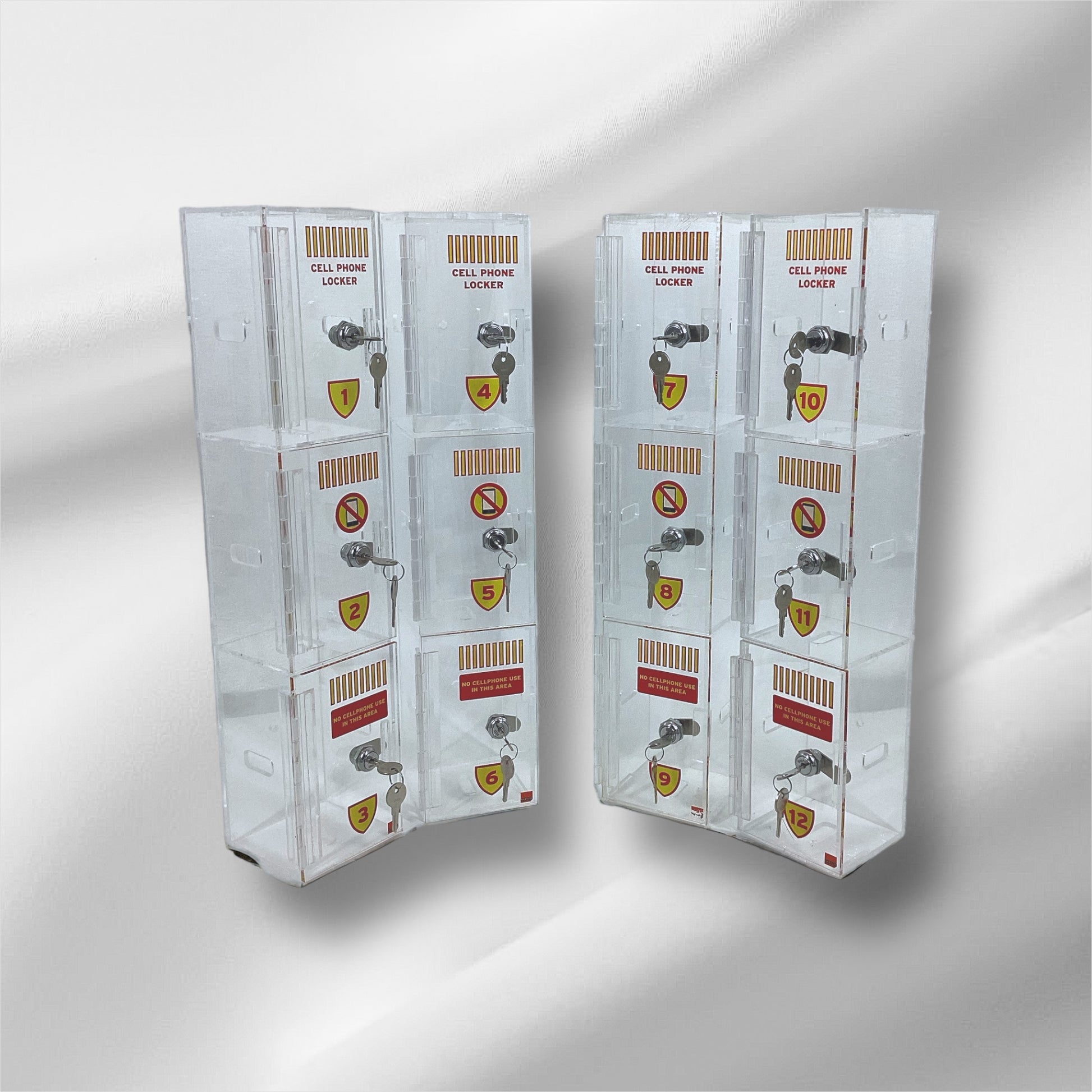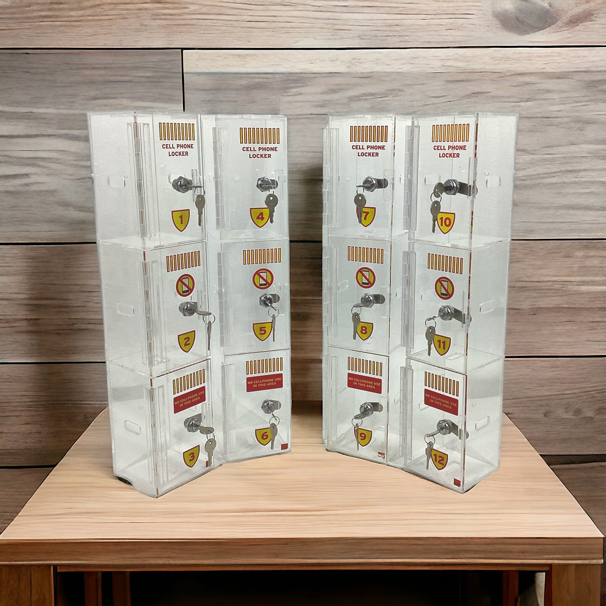 The clear acrylic material is great to keep items safe at it's shatter and impact resistant. The high durability characteristics is important for the function of this product. Your cell phone devices can hold your entire lives and are costly so it's safety is a considerable priority when you can't have it on you. Each locker door comes with a camlock that keeps the door secure, closed, and locked when you don't want anyone to access the items stored inside. Each camlock comes with a set of 2 keys that work exclusively with that lock.