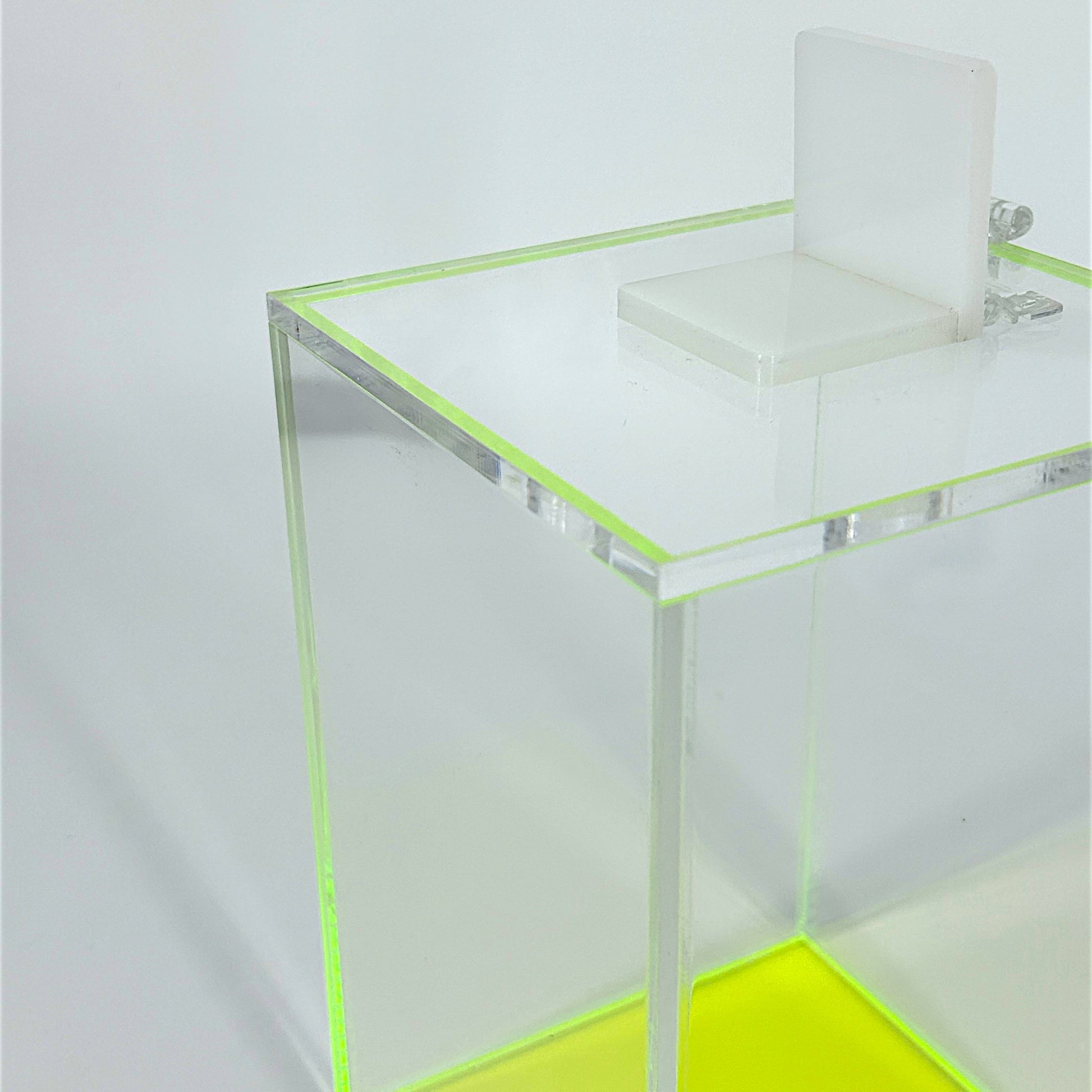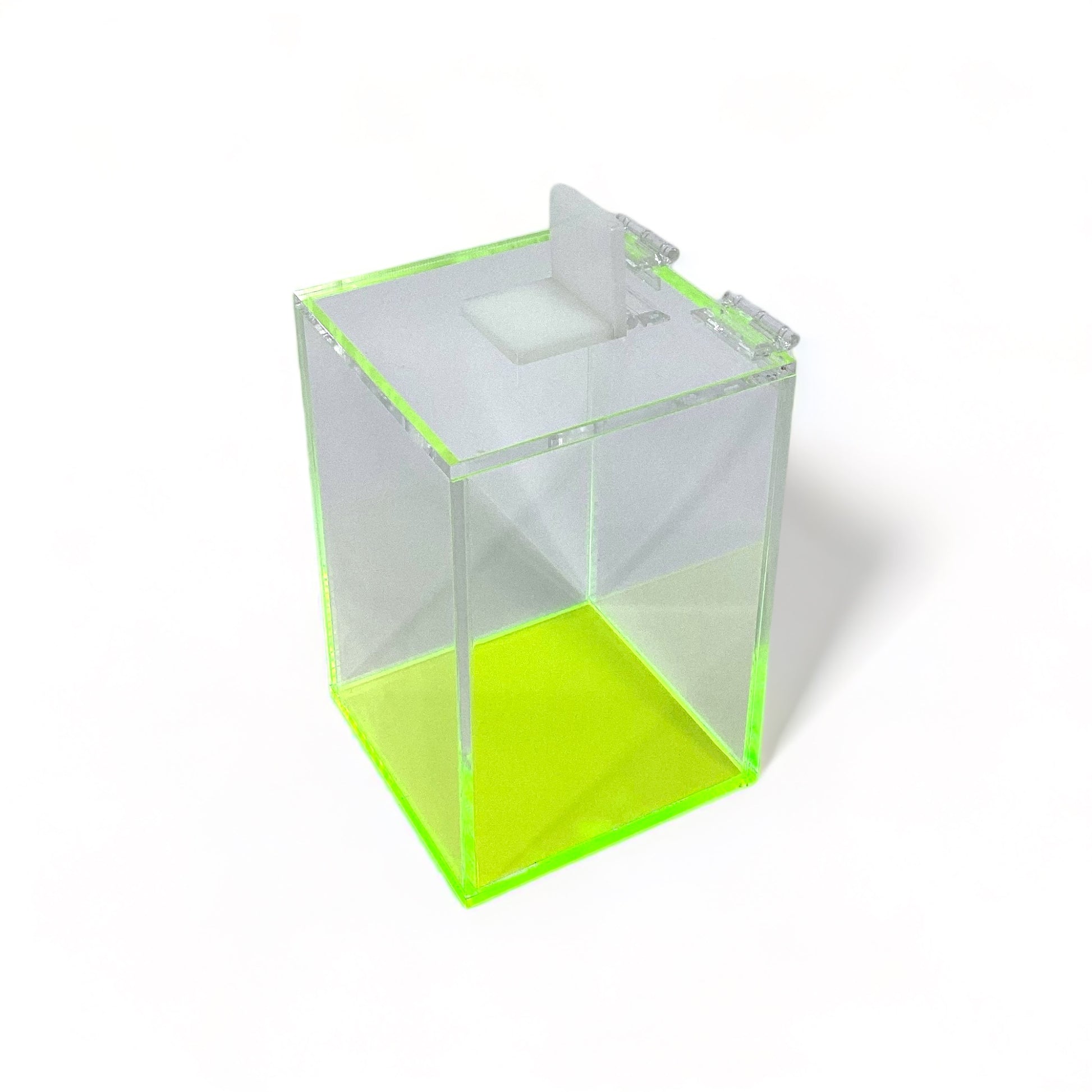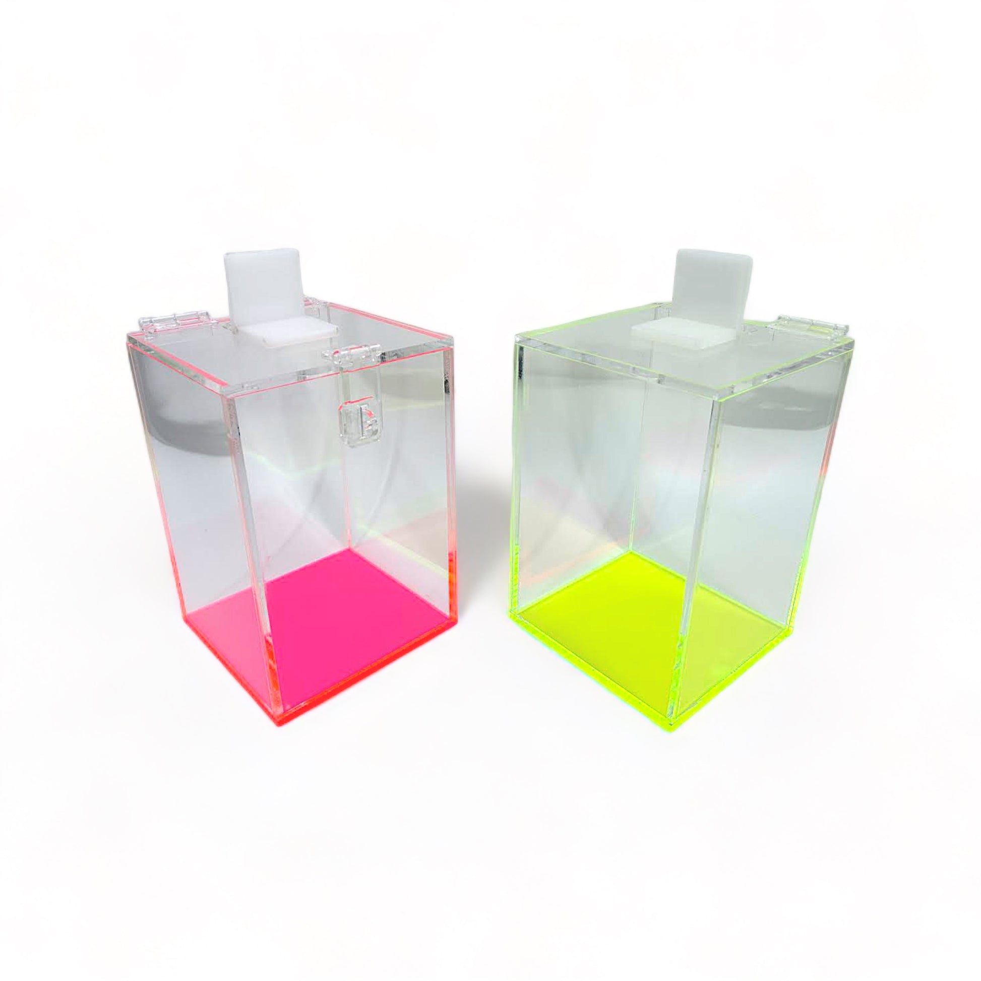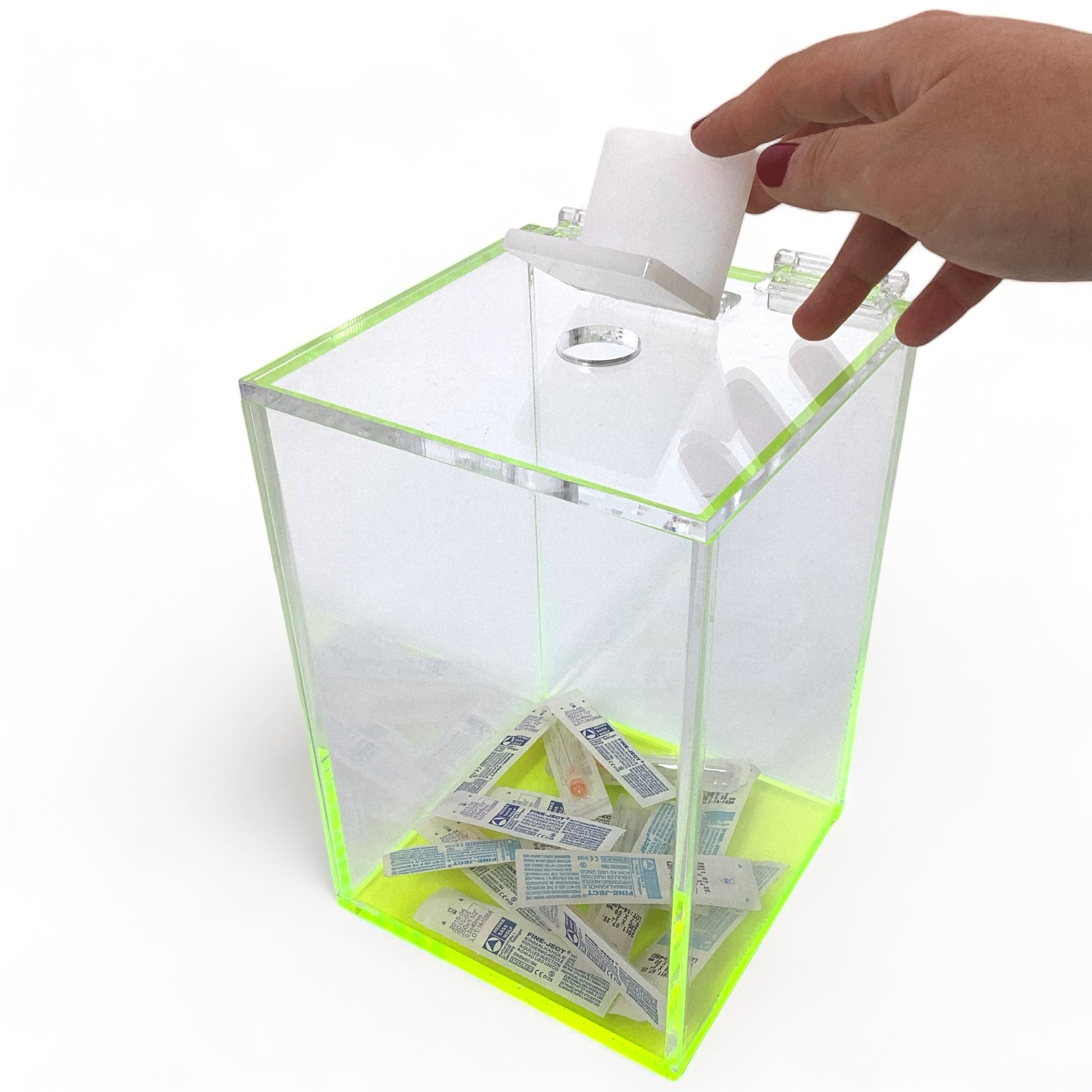 The laser cut acrylic hole is perfect for safely depositing any used items without using force. A white acrylic tab is used to conveniently cover the laser cut hole to prevent accidentally dropping other items and to cover any potentially sharp objects.