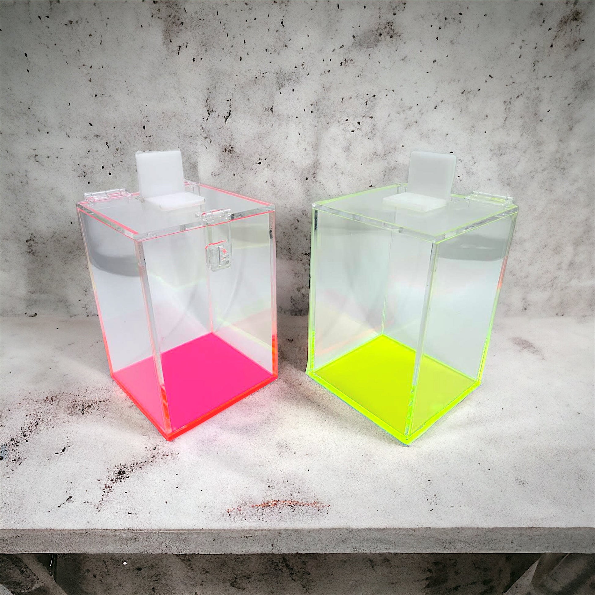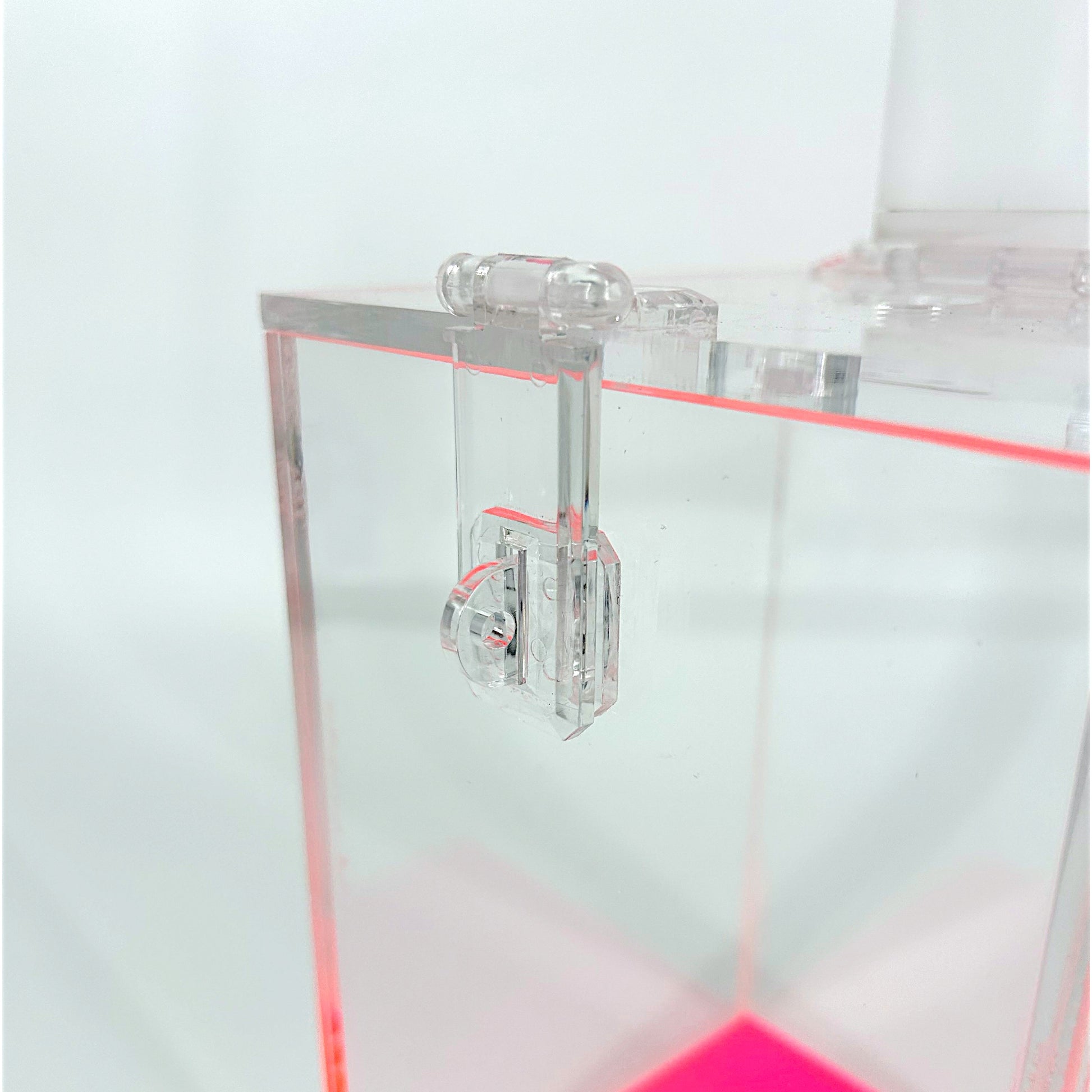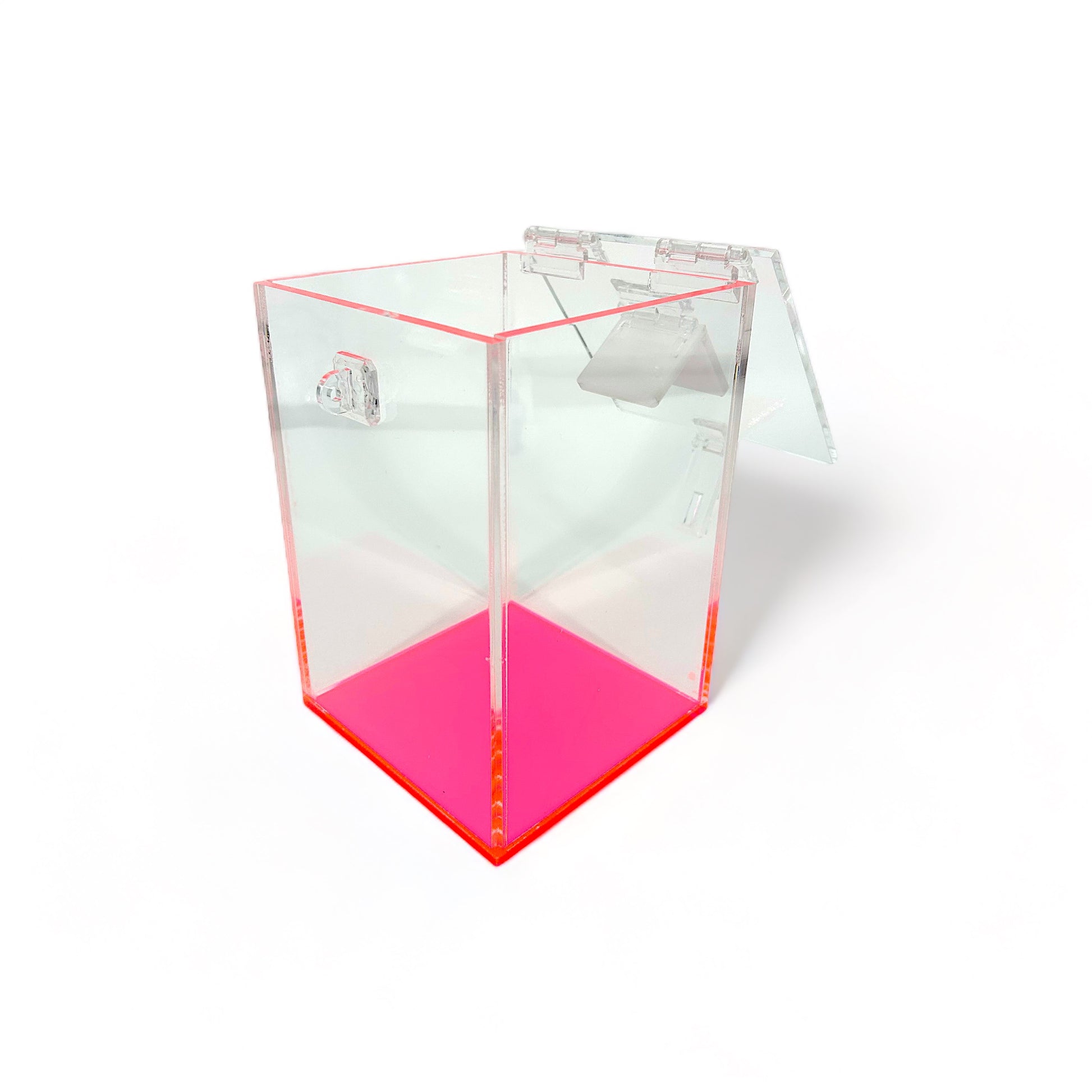 The laser cut acrylic hole is perfect for safely depositing any used items without using force. A white acrylic tab is used to conveniently cover the laser cut hole to prevent accidentally dropping other items and to cover any potentially sharp objects.
