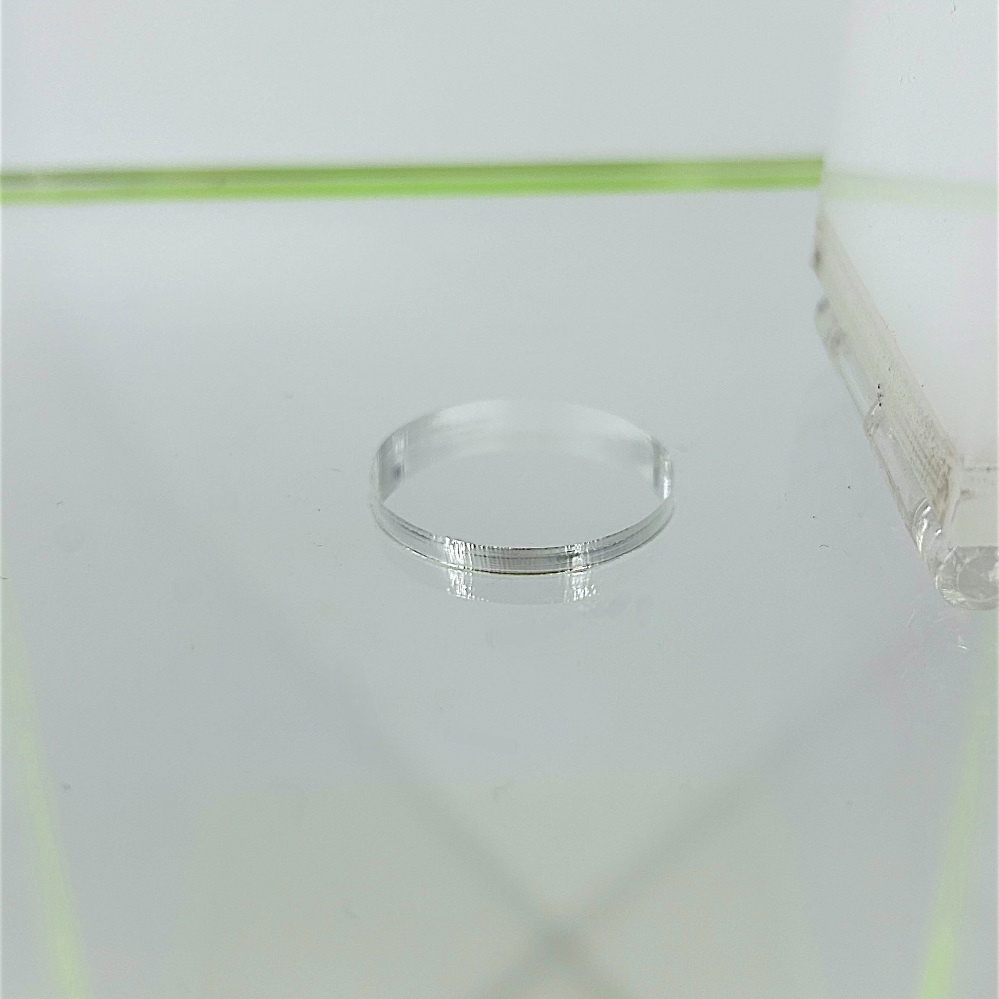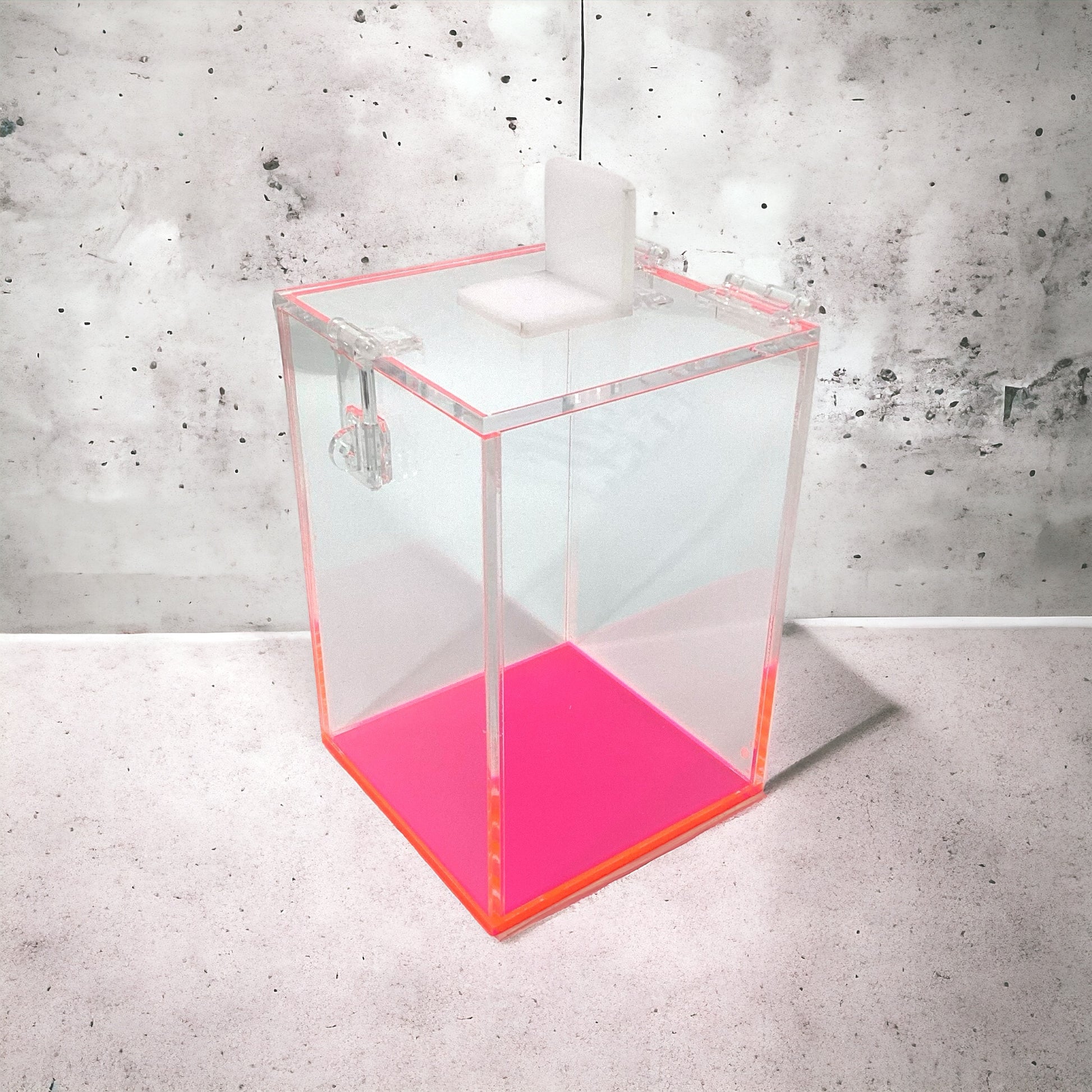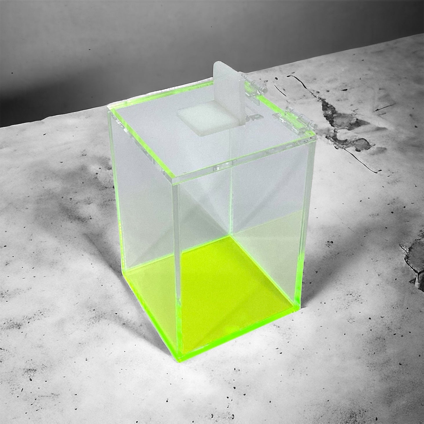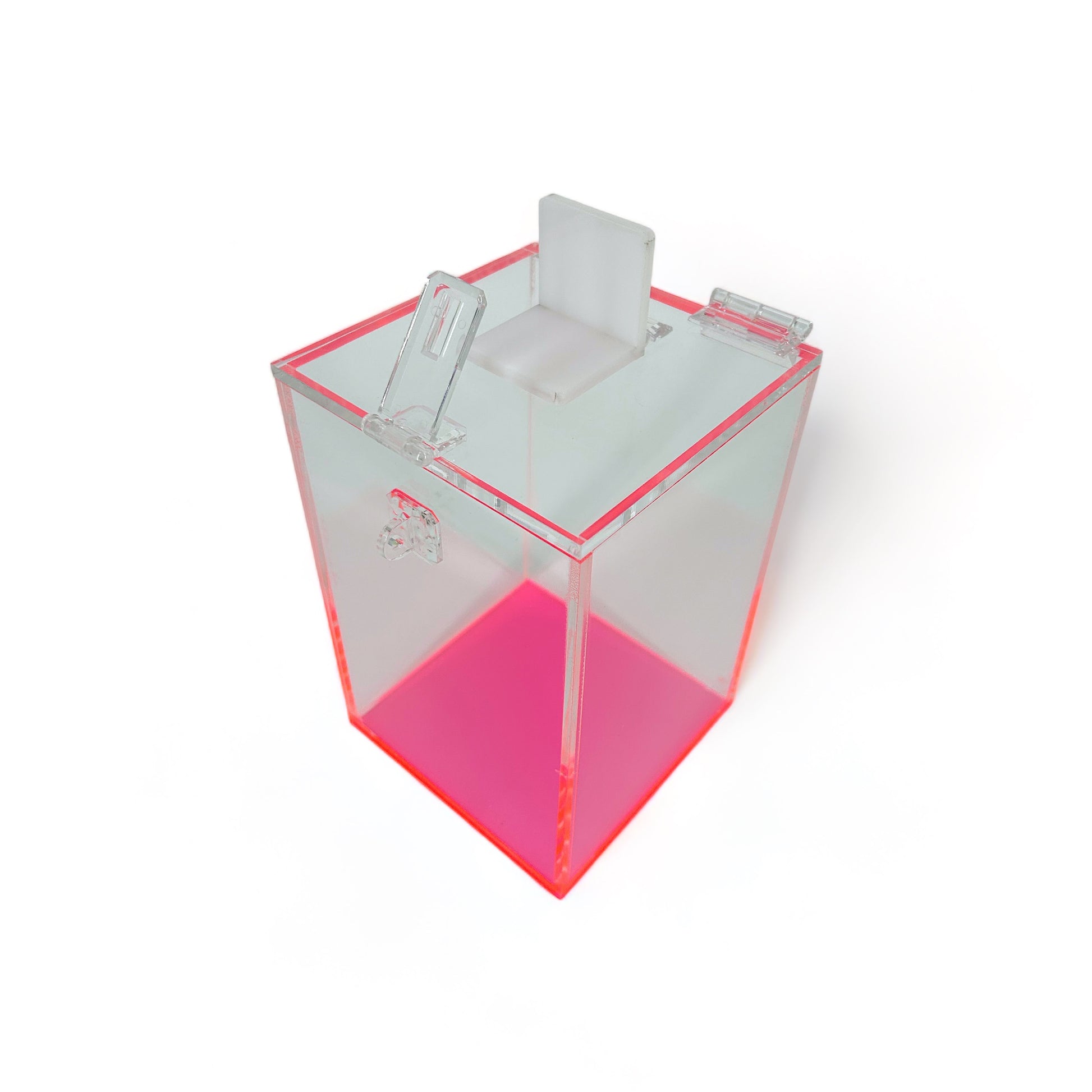 The laser cut acrylic hole is perfect for safely depositing any used items without using force. A white acrylic tab is used to conveniently cover the laser cut hole to prevent accidentally dropping other items and to cover any potentially sharp objects.