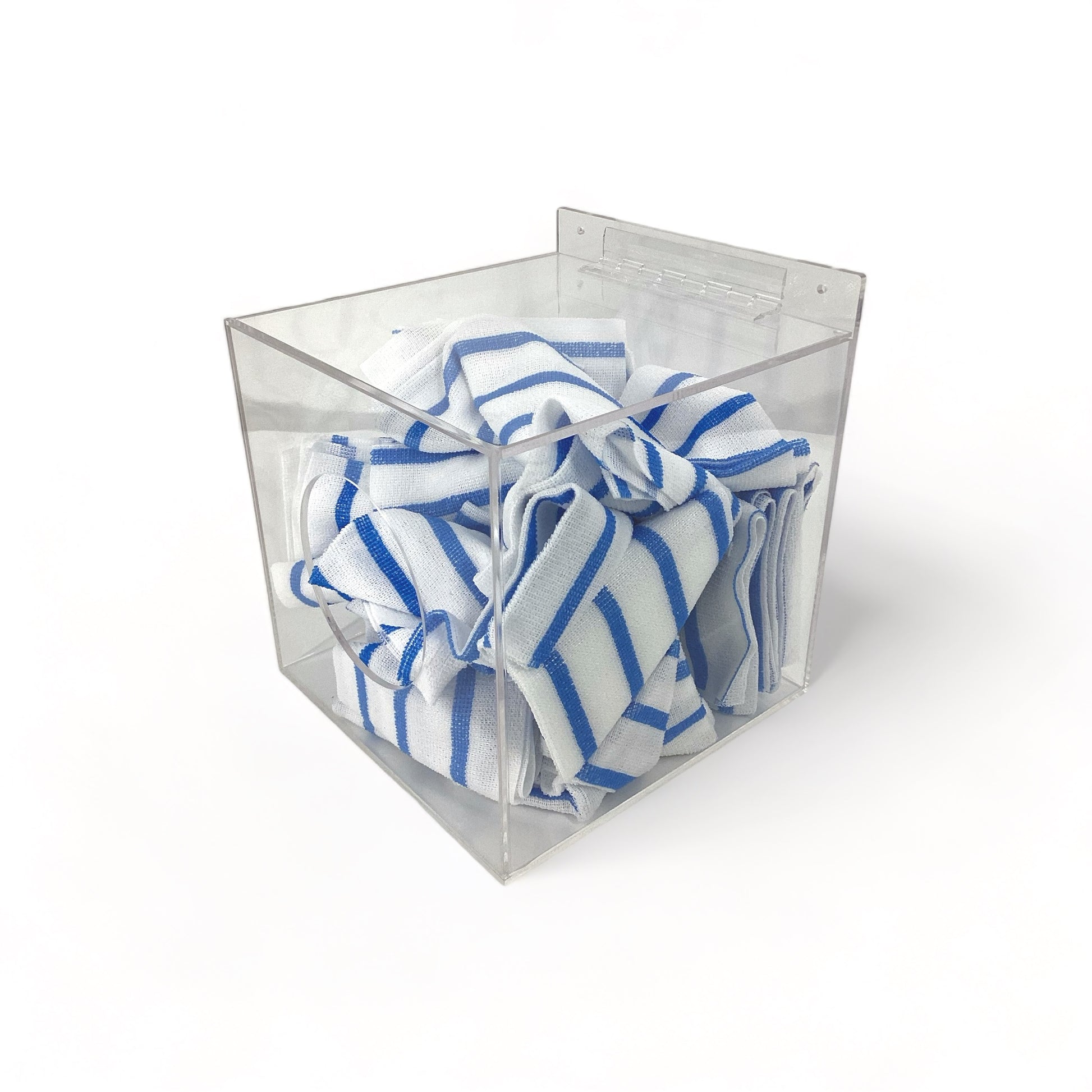This dispenser model is made from crystal clear acrylic material, lightweight and durable for long term use. A laser cut opening is placed in the front of the dispenser to allow your employees to quickly grab whatever items stored inside. Refilling is easy thanks to the hinged lid atop the dispenser. Simply lift, refill, and go.