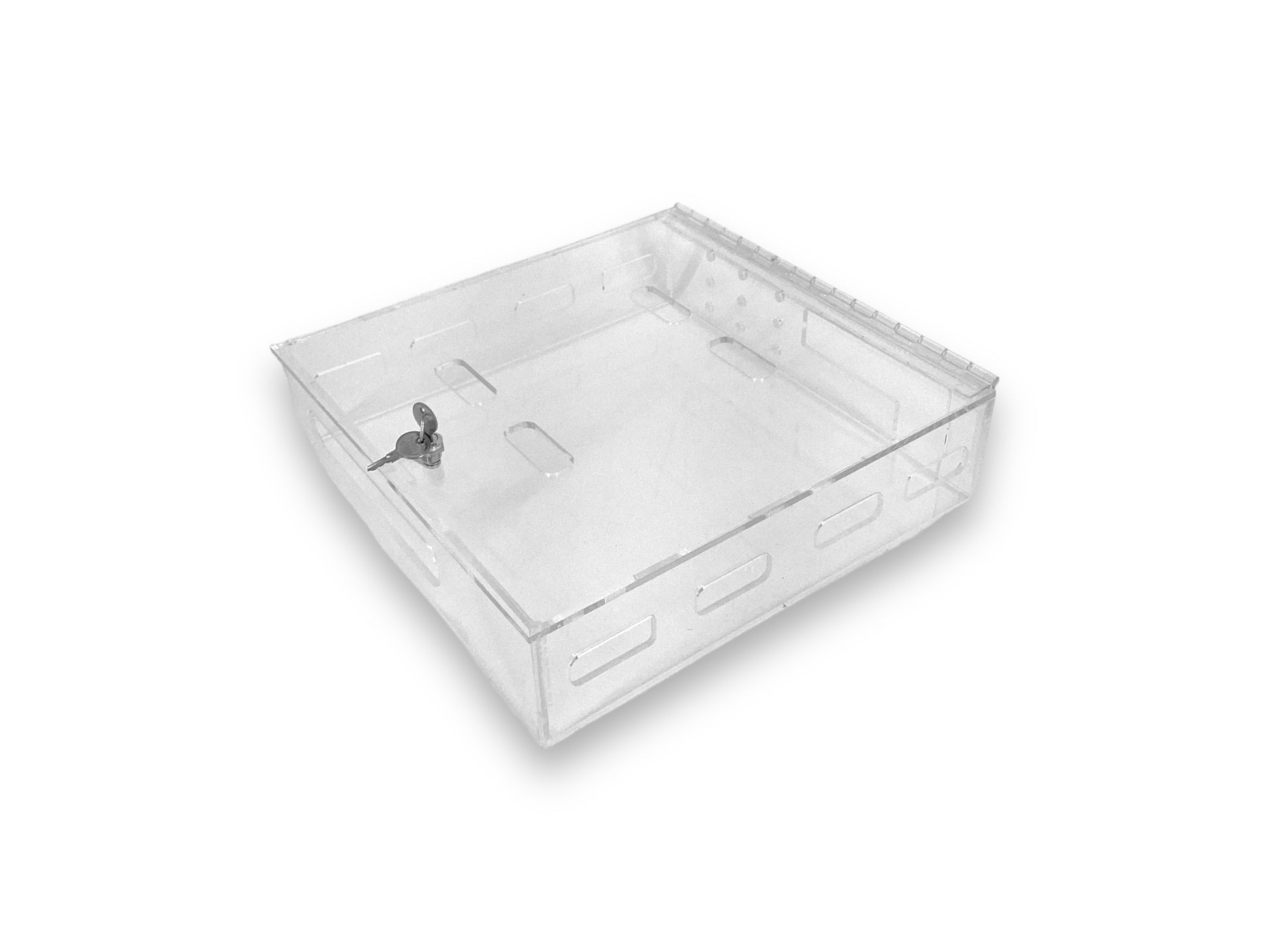 Made from clear thick acrylic. This acrylic case is available for connecting the system’s power supply, a/v cables through passing designed ventilation holes. Helps protects against dust and damage and it enhances the look of the item within. Lockable cam-lock with keys. Slot for disk withdrawal is cut out and gives you the option to put an acrylic blocker to cover the opening. This is great for libraries, school or personal use. Light security or theft deterrent. Suggested mounting options: Double-sided VHB tape or screws. PS4 Pro, screws, double-sided VHB tape not included.